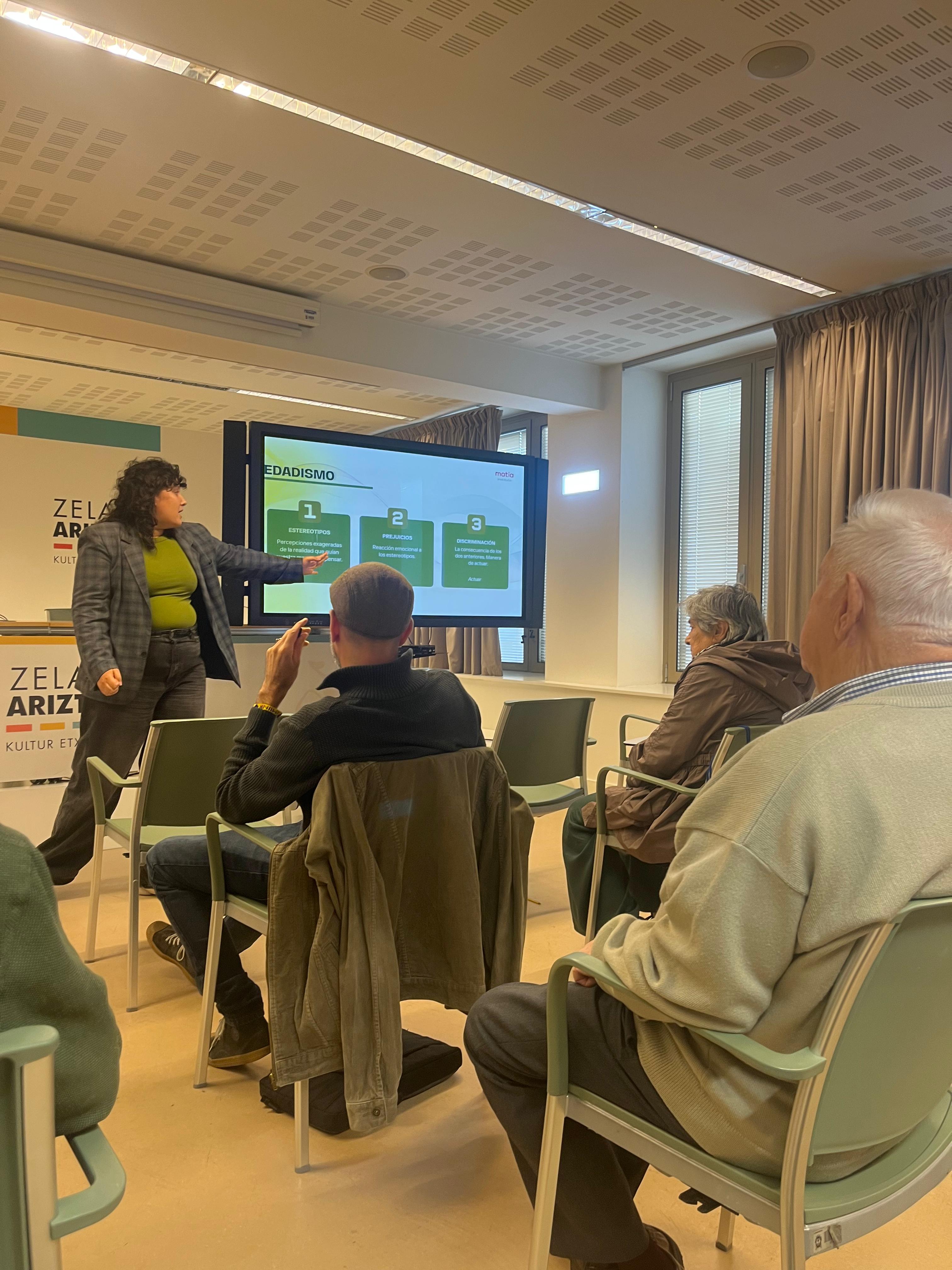 En el marco de la celebración de la Semana de las Personas Mayores en Zumárraga, desde el Ayuntamiento en colaboración con Nagusilan y el Consejo de personas mayores del municipio, han organizado una charla sobre Edadismo en la que, de manos de nuestra compañera Andrea Pozo, investigadora de Matia Instituto, se lleva a cabo una aproximación sobre el concepto "edadismo" con ejemplos prácticos y activar la reflexión sobre los estereotipos y creencias sobre la edad que aun tenemos presentes en nuestro día a día.
