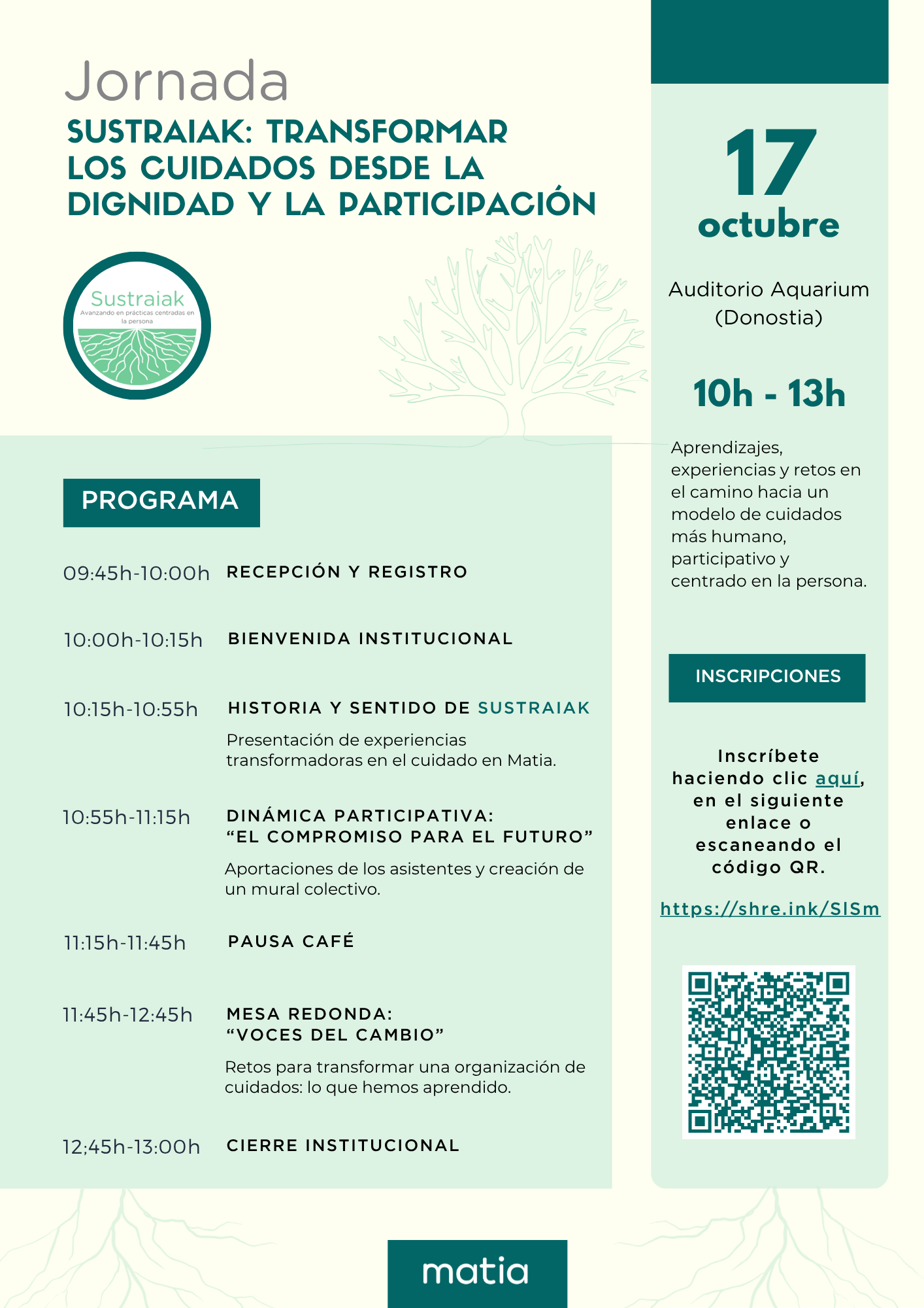 Este evento se enmarca dentro del proyecto Sustraiak, impulsado por Matia, que busca avanzar hacia un modelo de atención verdaderamente centrado en cada persona: en su dignidad, sus derechos, sus valores y su vida cotidiana. ¿Y por qué Sustraiak? Porque significa raíces. Porque este cambio quiere ser profundo, duradero y compartido. Porque transformar el modelo de cuidados es una tarea colectiva. Sustraiak se desarrolla en las viviendas de Lamourous y Bermingham, y propone nuevas formas de cuidar, convivir y decidir desde la participación de todas las personas implicadas.