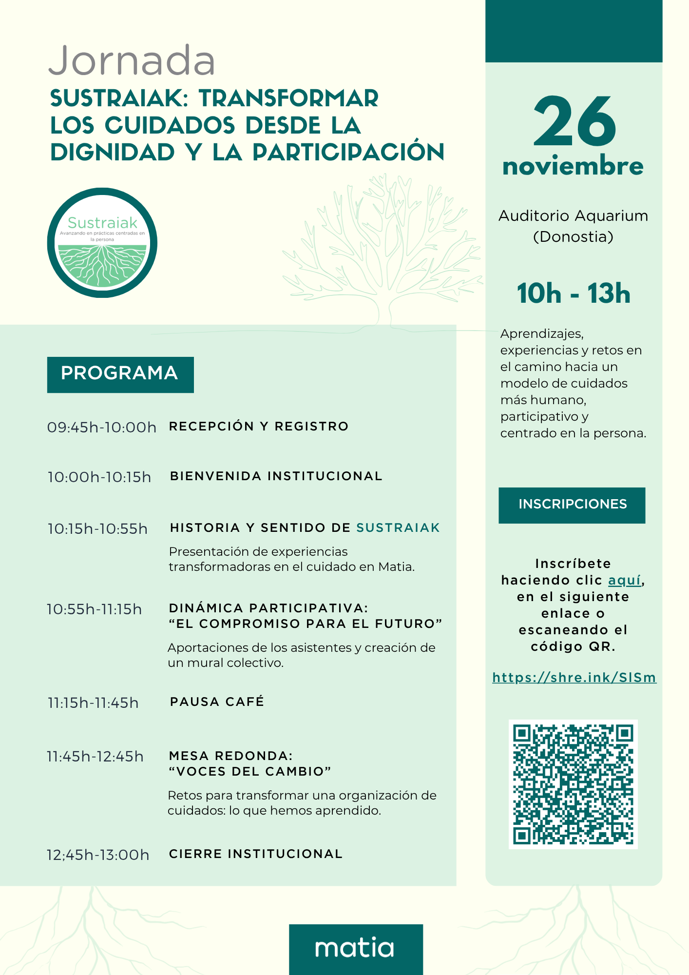 “Sustraiak: Transformar los cuidados desde la dignidad y la participación”, una jornada en la que compartiremos aprendizajes, experiencias y retos en el camino hacia un modelo de cuidados más humano, participativo y centrado en la persona.