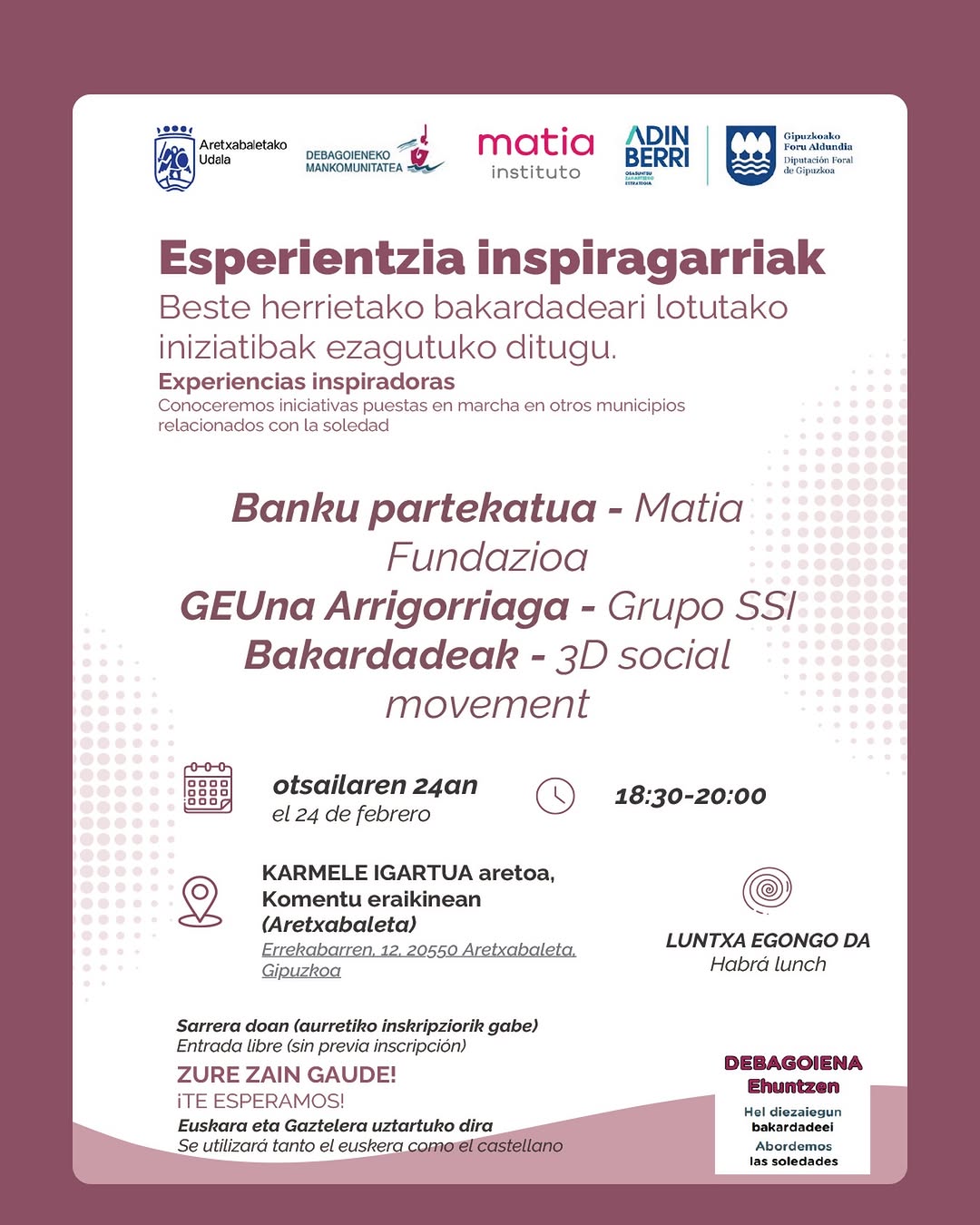 Datorren otsailaren 24an Debagoiena Ehuntzen proiektuaren barruan antolatutako bigarren jardunaldia egingo da, nahi ez den bakardadearen aurkako hausnarketa eta ekintza komunitarioa ardatz hartuta.